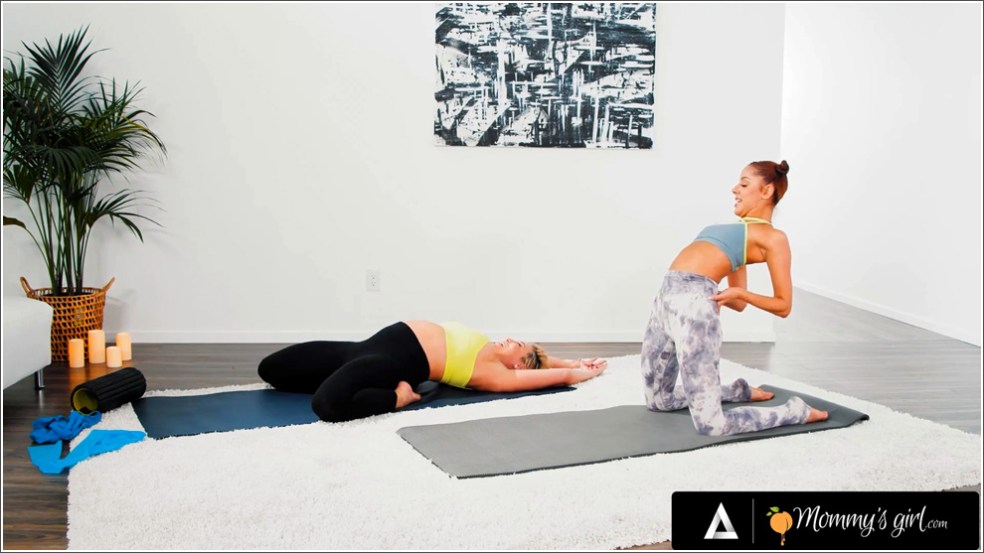 We’re watching “Making Mommy Sweat” from Mommy’s Girl, featuring Ryan Keely and Vanna Bardot. This is a lesbian scene that will hopefully show how yoga works as a prompt for sex in porn.